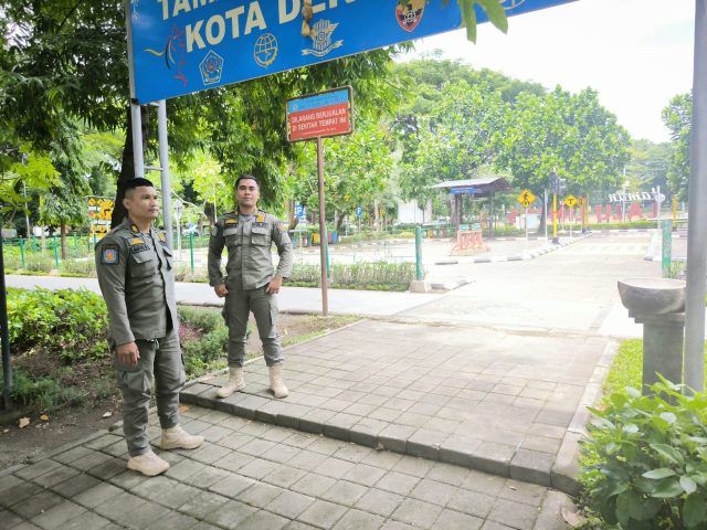 JAGA TAMAN KOTA – Tim Satpol PP Kota Denpasar saat melaksanakan penjagaan di Kawasan Taman Kota Sewakadarma Lumintang Denpasar pada Sabtu (18/1).