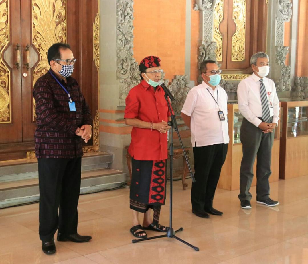 Gubernur Bali Wayan Koster, Senin (13/4) menggelar jumpa pers terkait bagaimana upaya untuk meningkatkan dan memperkuat pencegahan dan penanggulangan covid-19. Saat itu, Gubernur didampingi Wagub Cok. Ace dan Sekda Dewa Made Indra.