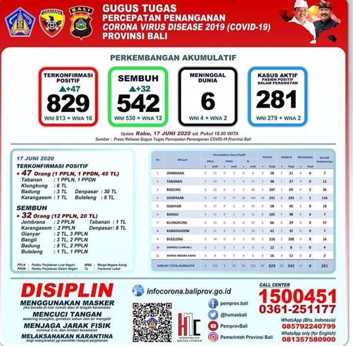 Kasus positif covid-19 di Bali, Rabu (17/6) bertambah 47 orang. Penderita baru ini terdiri atas 1 pekerja migran Indonesia (PMI), 1 orang imported case Indonesia dan 45 orang transmisi lokal. Dengan tambahan ini, jumlah kasus positif covid-19 di Bali menjadi 829 orang.