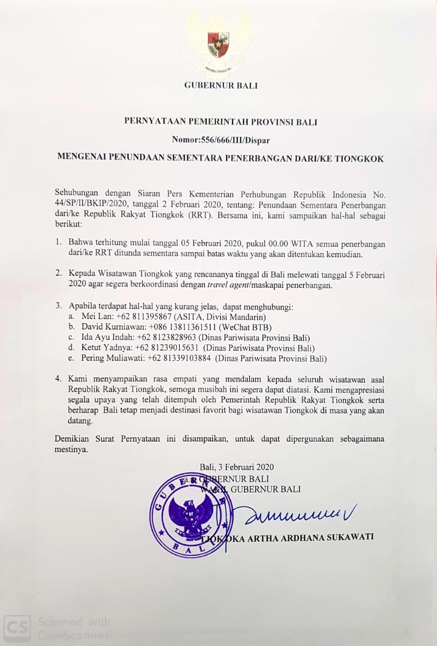 Terkait dengan siaran pers Kemenhub RI No. 44/SP/II/BKIP/2020, tentang penundaan sementara penerbangan dari dan ke Tiongkok, Pemerintah Provinsi Bali pun mengeluarkan pernyataan resmi.