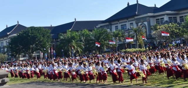 Setelah upacara penaikan bendera sang merah putih dalam rangka memperingati HUT RI ke-74, pada sore hari dilaksanakan Aubade dan penurunan bendara serta pementasan tari pendet massal dari anak-anak Paud yang berjumlah 2.310 dari 195 lembaga Paud se-Badung, Sabtu (17/8), di Lapangan Pusat Pemerintahan Kabupaten Badung, Mangupraja Mandala.