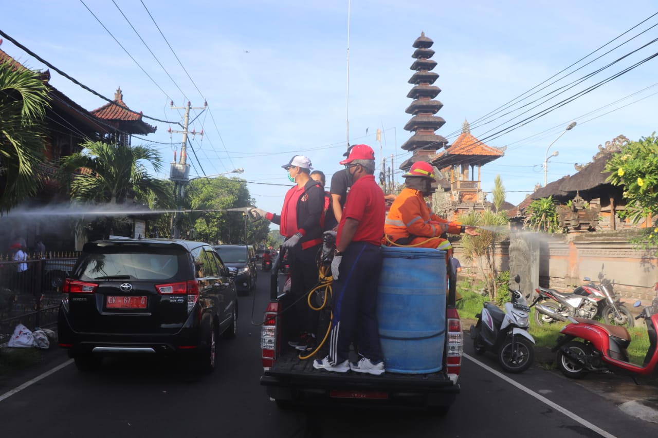 Wakil Bupati Badung I Ketut Suiasa memimpin langsung penyemprotan disinfektan masal di wilayah Desa Munggu Kecamatan Mengwi, Minggu (12/4). Meskipun Pemkab telah gencar dan intensif dalam melakukan upaya pencegahan penyebaran covid-19, masyarakat juga dihimbau harus bisa mengimbanginya dengan melakukan bersih-bersih di rumah masing-masing.