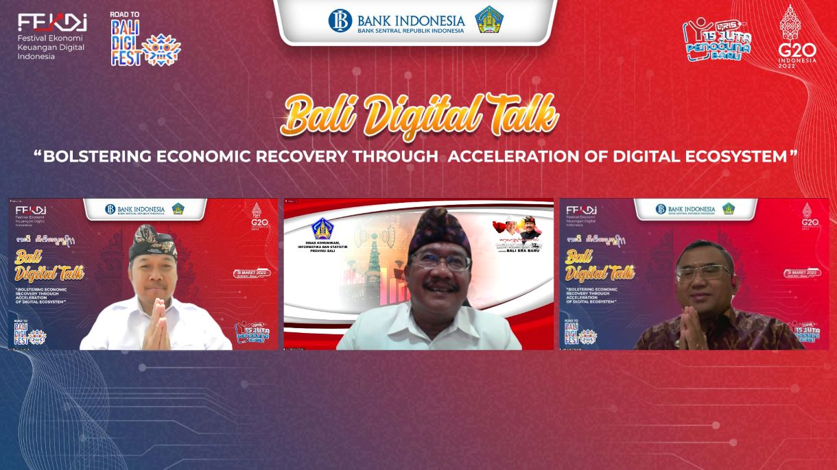Dalam rangka mendorong perluasan dan penguatan ekosistem digital di Bali dan mempercepat pemulihan ekonomi Bali, khususnya melalui digitalisasi pada sektor ekonomi kreatif, Kantor Perwakilan Bank Indonesia Provinsi Bali menyelenggarakan kegiatan Web Seminar nasional dengan topik utama “Bali Digital Talk: Bolstering Economic Recovery Through Accelaration Of Digital Ecosystem” pada Kamis (31/3) secara daring. Webinar nasional ini dihadiri langsung anggota Komisi XI DPR RI, Kepala Perwakilan Bank Indonesia Provinsi Bali, serta Gubernur Bali yang diwakili oleh Kepala Dinas Komunikasi, Informatika dan Statistik Provinsi Bali.