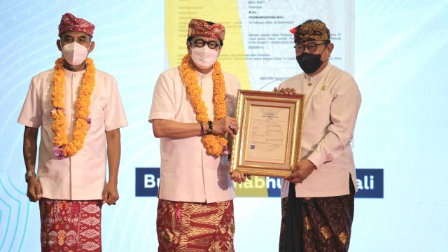 PENGHARGAAN – Mewakili Gubernur Bali, Wagub Cok. Ace menerima penghargaan dari Direktorat Jenderal Kekayan Intelektual (DJKI) Kementerian Hukum dan HAM, Selasa (14/6/2022).