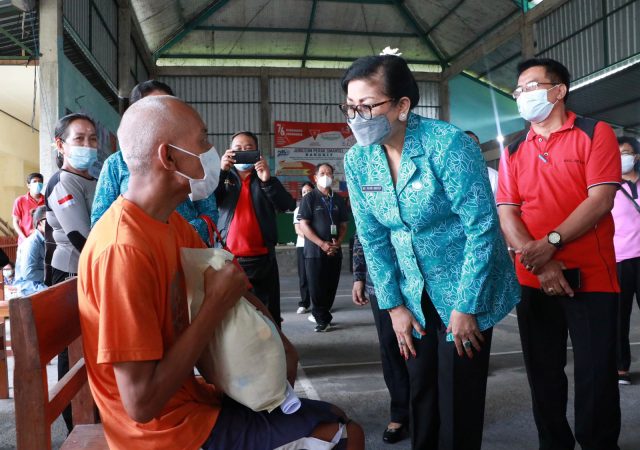 KAUM DIFABEL – Ketua TP PKK Bali Ny. Putri Suastini Koster meninjau vaksinasi bagi kaum difabel sekaligus memberikan bantuan sembako, di Karangasem, Jumat (3/9/2021).