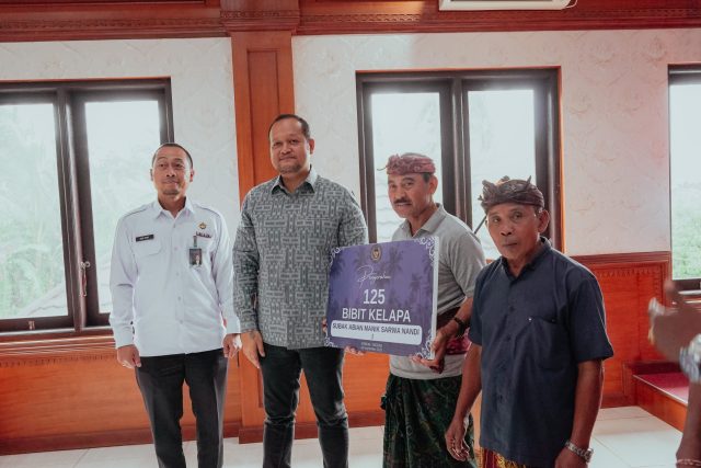 Pada kesempatan ini juga, Wabup Bagus Alit Sucipta menyerahkan secara simbolis 1.000 bibit pohon kelapa kepada masing-masing kelian subak dan kelian subak abian se-Desa Sobangan.