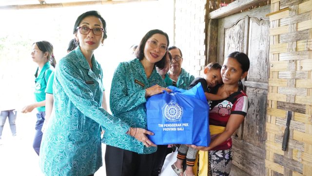 Dilanjutkan penyerahan paket bantuan yang berisi beras 10 kg, telur 1 krat, susu 6 kotak dan sikat beserta pasta gigi oleh Pj. Ketua Tim Penggerak PKK Provinsi Bali kepada balita dan penyuapan PMT (Pemberian Makanan Tambahan) kepada perwakilan 5 balita.