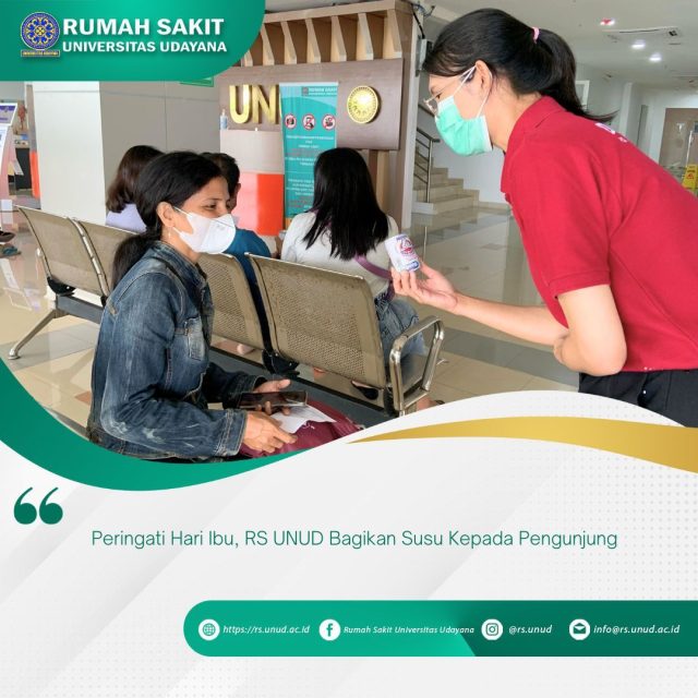 Dalam rangka memperingati Hari Ibu, RS UNUD membagikan susu kepada pengunjung, terutama para perempuan dan Ibu pada Jumat (22/12). Kegiatan tersebut dilakukan di ruang tunggu Poliklinik Spesialis bekerja sama dengan PT Nestlé Indonesia. Pembagian susu kepada pengunjung dan pasien dilakukan langsung oleh Brand Ambassador RS UNUD, Ns. Ni Luh Dianthi Handayani, S.Kep sekaligus menyapa pengunjung dan pasien di Poliklinik RS UNUD.