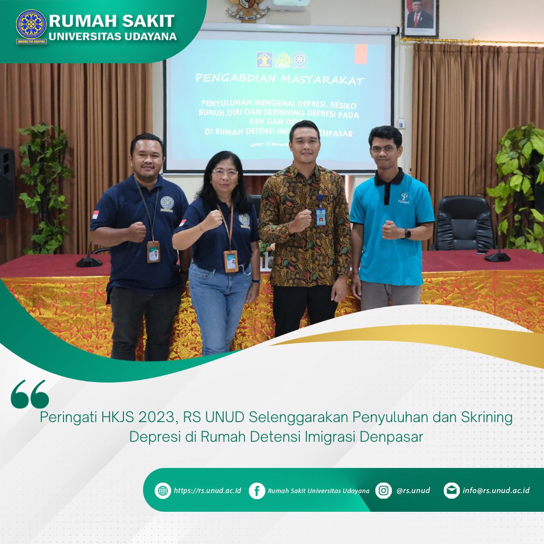Dalam rangka memperingati Hari Kesehatan Jiwa Sedunia 2023 yang jatuh pada 10 Oktober, RS UNUD menggelar kegiatan penyuluhan dan skrining depresi di Rumah Detensi Imigrasi (Rudenim) Denpasar, Jumat (3/11). Kegiatan yang dibuka langsung oleh Kepala Seksi Perawatan dan Kesehatan Rudenim Denpasar, Raden Fajar Jaya Wicaksono bersama Ketua Panitia Penyelenggara Kegiatan HKJS 2023 RS UNUD, dr. I Gusti Agung Indah Ardani, Sp.KJ (K) tersebut diikuti oleh para petugas serta deteni atau imigran di Rudenim Denpasar.