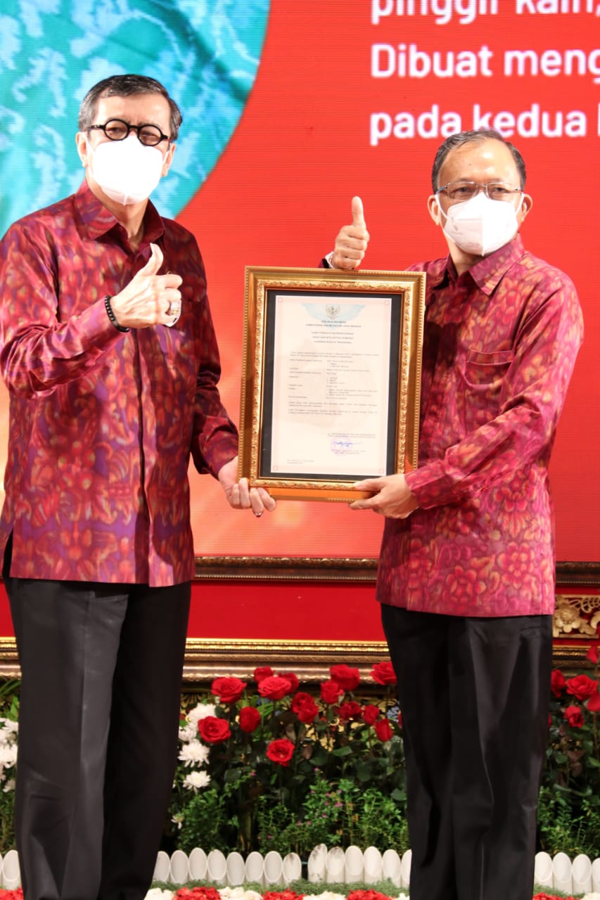 SERTIFIKAT KI – Gubernur Wayan Koster menerima sertifikat KI dari Menkumham Yasonna H. Laoly, Jumat (5/2/2021).