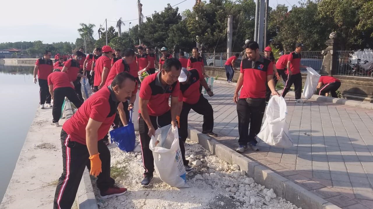 SAMPAH PLASTIK – Dirut Perumda Air Minum Tirta Mangutama Badung Ketut Golak berbaur bersama karyawan dan karyawati untuk bersih-bersih sampah plastik di IPA Estuary Dam Kuta, Jumat kemarin.