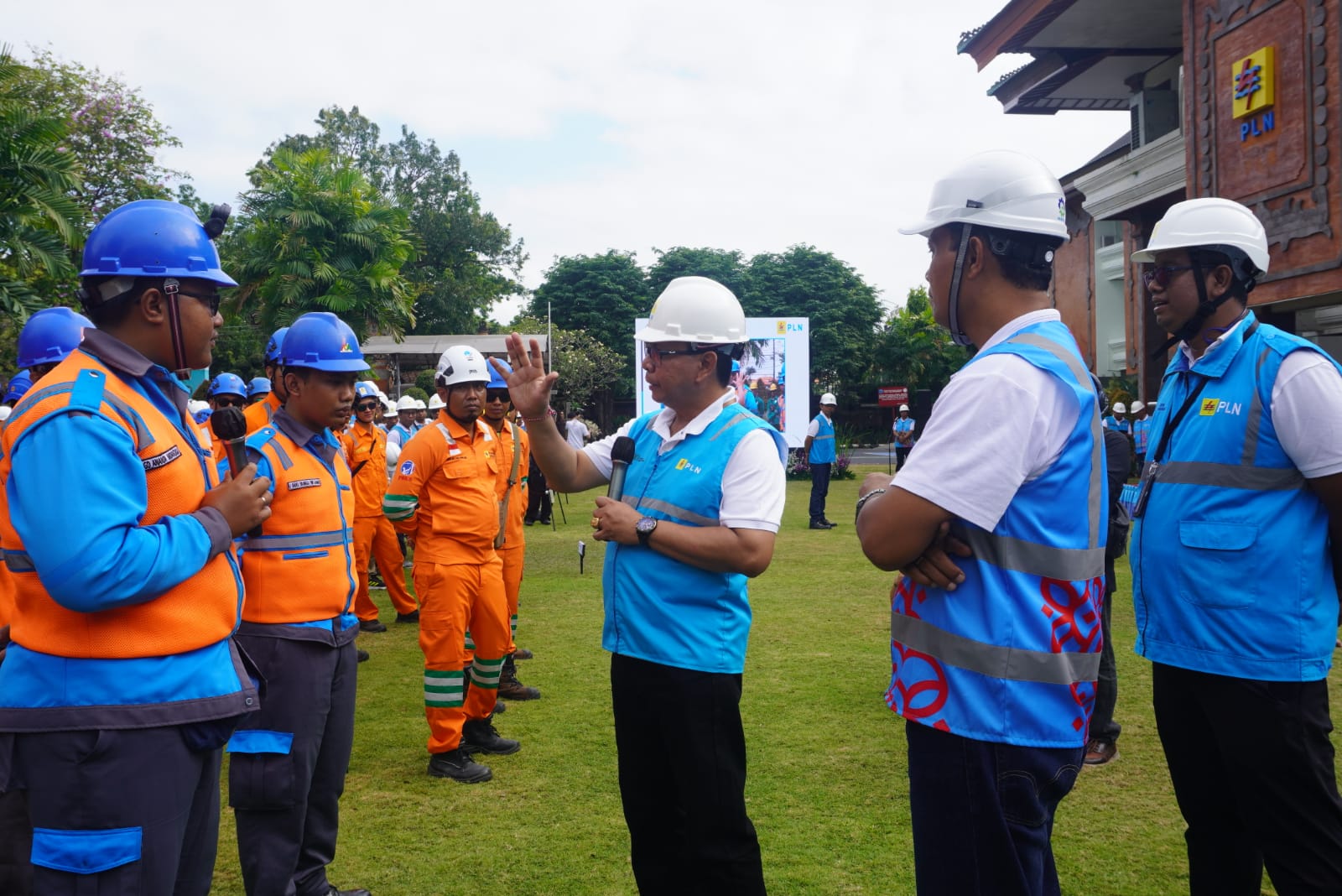 APEL SIAGA – EVP ODJ PT PLN (Persero) Ida Bagus Ari Wardana didampingi GM PLN UID Bali I Wayan Udayana dan Manager UP3 Bali Selatan I Putu Kariana menyempatkan diri berbincang dengan salah satu peserta apel siaga di sela-sela acara inspeksi peralatan siaga kelistrikan KTT AIS 2023.