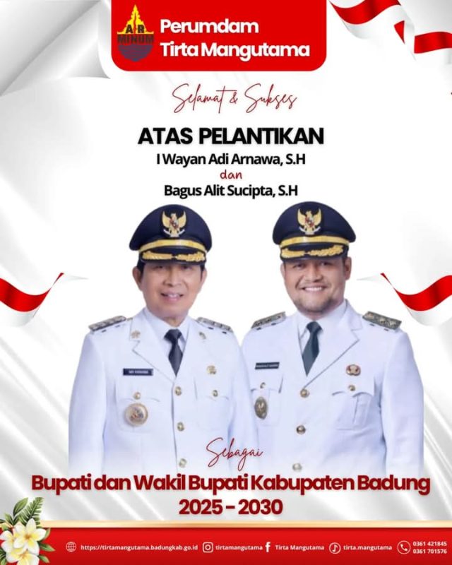 Beranda Badung News Perumdam Tirta Mangutama Ucapkan Selamat dan Sukses Atas Pelantikan I Wayan Adi... Badung NewsBerita UtamaHukum Perumdam Tirta Mangutama Ucapkan Selamat dan Sukses Atas Pelantikan I Wayan Adi Arnawa dan Bagus Alit Sucipta Sebagai Bupati dan Wabup Badung 2025-2030 Penulis BaliViralNews - Februari 20, 2025 FacebookTwitterPinterestWhatsApp Baca Juga Kasus Baru Covid-19 Bali Bertambah 278, Kasus Sembuh Melonjak 328 Orang