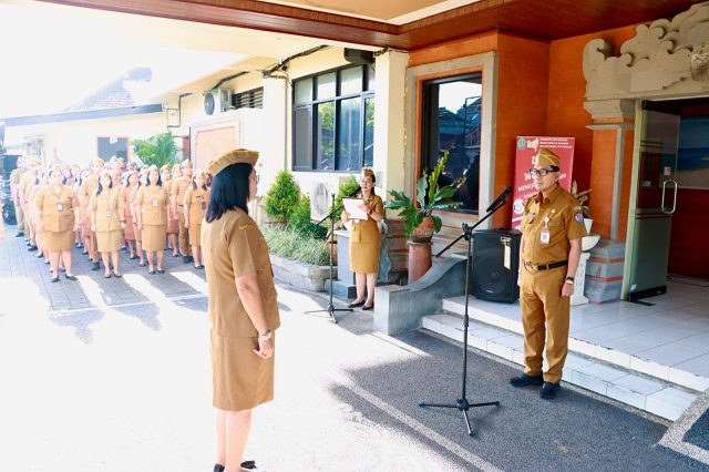 APEL DISIPLIN – Sekretaris Daerah (Sekda) Kota Denpasar I Gusti Ngurah Eddy Mulya, memimpin apel disiplin di lingkungan pegawai Badan Pengelola Keuangan dan Aset Daerah (BPKAD) Kota Denpasar, Senin (30/3).