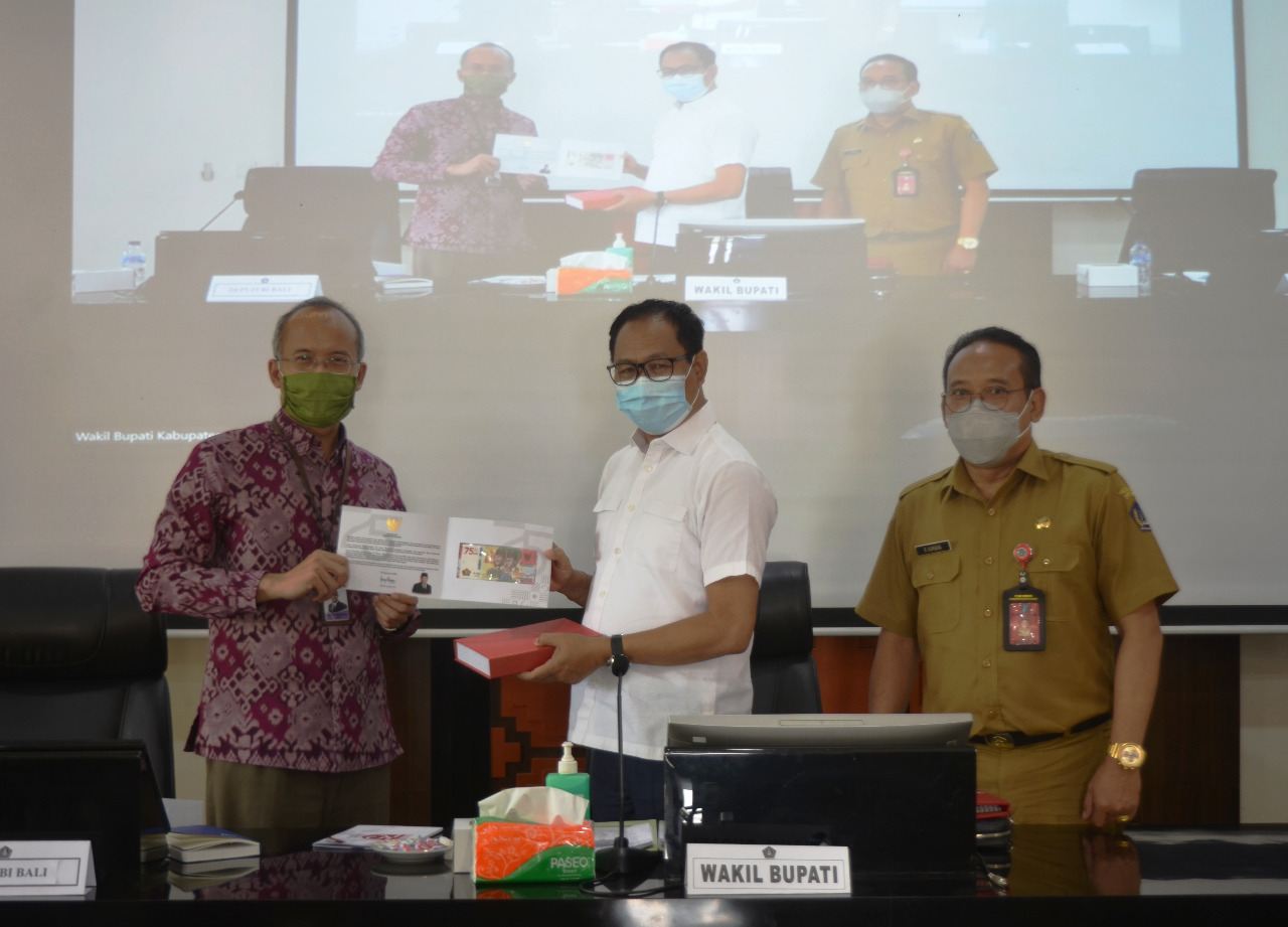 RP 75.000 – Wabup Suiasa saat menerima uang pecahan Rp 75.000 dari Bank Indonesia (BI) Perwakilan Bali yang diserahkan oleh Deputi Bank Indonesia Wilayah Bali, Rizki Wimanda, Selasa (8/9/2020).