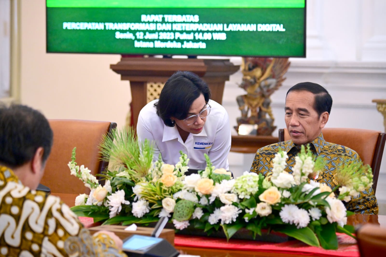 Presiden Joko Widodo memimpin rapat terbatas (ratas) bersama jajarannya untuk membahas percepatan transformasi dan keterpaduan layanan digital di Istana Merdeka, Jakarta, Senin, 12 Juni 2023. Dalam arahannya, Presiden Jokowi terus mendorong birokrasi agar berdampak, tidak berbelit-belit, lincah, dan cepat.