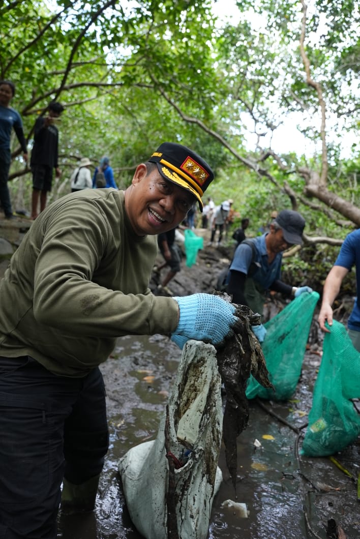 Pj. Gubernur Bali SM Mahendra Jaya bersama dengan Sungai Watch turun bersama membersihkan hilir sungai di Kawasan Mangrove Tahura Ngurah Rai Denpasar pada Minggu (26/11) siang. “Ternyata tidak mudah membersihkan sampah yang sudah telanjur dibuang di sungai,” ungkap Mahendra Jaya saat terjun memunguti sampah di sela-sela tanaman bakau.