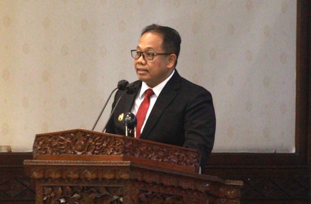 JAWABAN – Pj. Gubernur Bali SM Mahendra Jaya memberikan jawaban atas pandangan umum Fraksi-fraksi DPRD Bali terhadap dua raperda, Senin (1/7/2024).