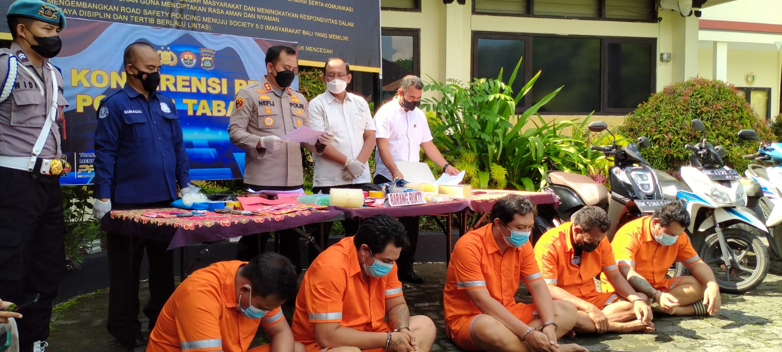 Selama dua minggu Polres Tabanan meringkus tujuh orang pelaku pengedar narkotika jenis shabu, satu di antaranya oknum anggota TNI aktif Kodam IX/Udayana. Saat ini kasusnya ditangani Detasemen Polisi Militer (Denpom), sedangkan satu orang lainnya merupakan residivis kasus serupa, baru keluar masa tahanan pada 2020.