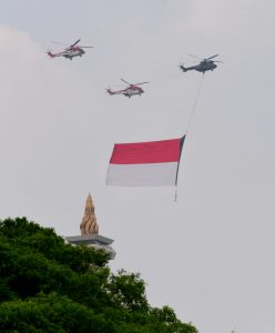 Ada yang sedikit berbeda pada upacara kali ini, yakni adanya fly pass helikopter yang membawa bendera Merah Putih ukuran raksasa. Enam helikopter yang membawa dua bendera berukuran 20 meter kali 30 meter melintas dari arah kiri podium dan disambut tepuk tangan para hadirin.