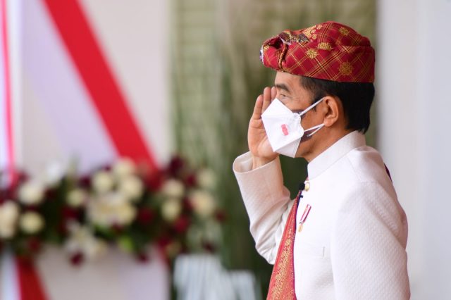 Presiden Joko Widodo memimpin upacara Peringatan Detik-detik Proklamasi Kemerdekaan Republik Indonesia yang digelar di halaman Istana Merdeka, pada Selasa, 17 Agustus 2021. Kepala Negara hadir bersama Ibu Negara Iriana Joko Widodo dan didampingi oleh Wakil Presiden Ma’ruf Amin beserta Ibu Wury Ma’ruf Amin.