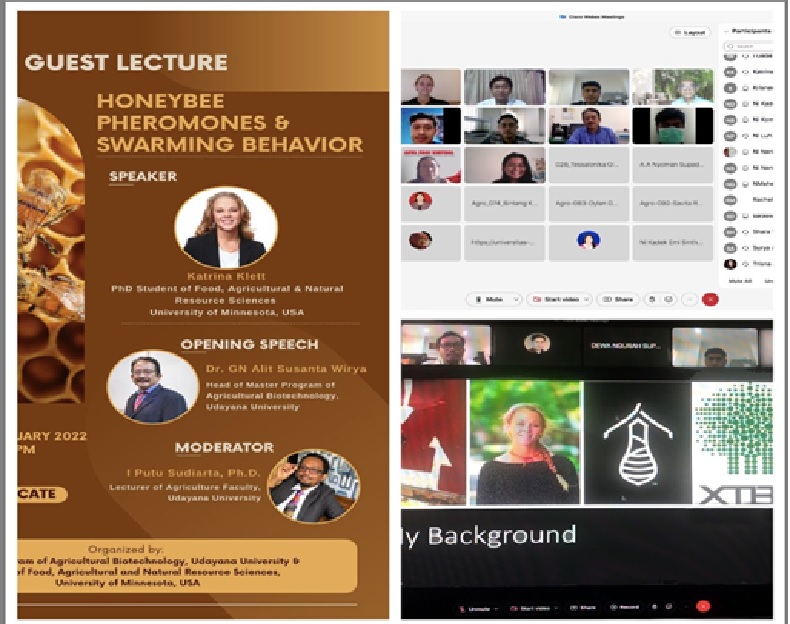 Program Studi Magister Bioteknologi Pertanian, Fakultas Pertanian, Universitas Udayana bekerja sama dengan College of Food, Agricultural and Natural Resource Sciences, University of Minnesota, USA menyelenggarakan webinar tentang Honeybee Pheromones & Swarming Behaviour yang dilaksanakan dalam bentuk kuliah tamu.