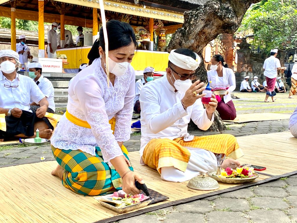 Wali Kota Denpasar IGN Jaya Negara didampingi Ketua TP PKK Kota Denpasar, Ny. Sagung Antari Jaya Negara hadir langsung dalam persembahyangan dan memastikan diterapkannya protokol kesehatan dalam pelaksanaan perdembahyangan.