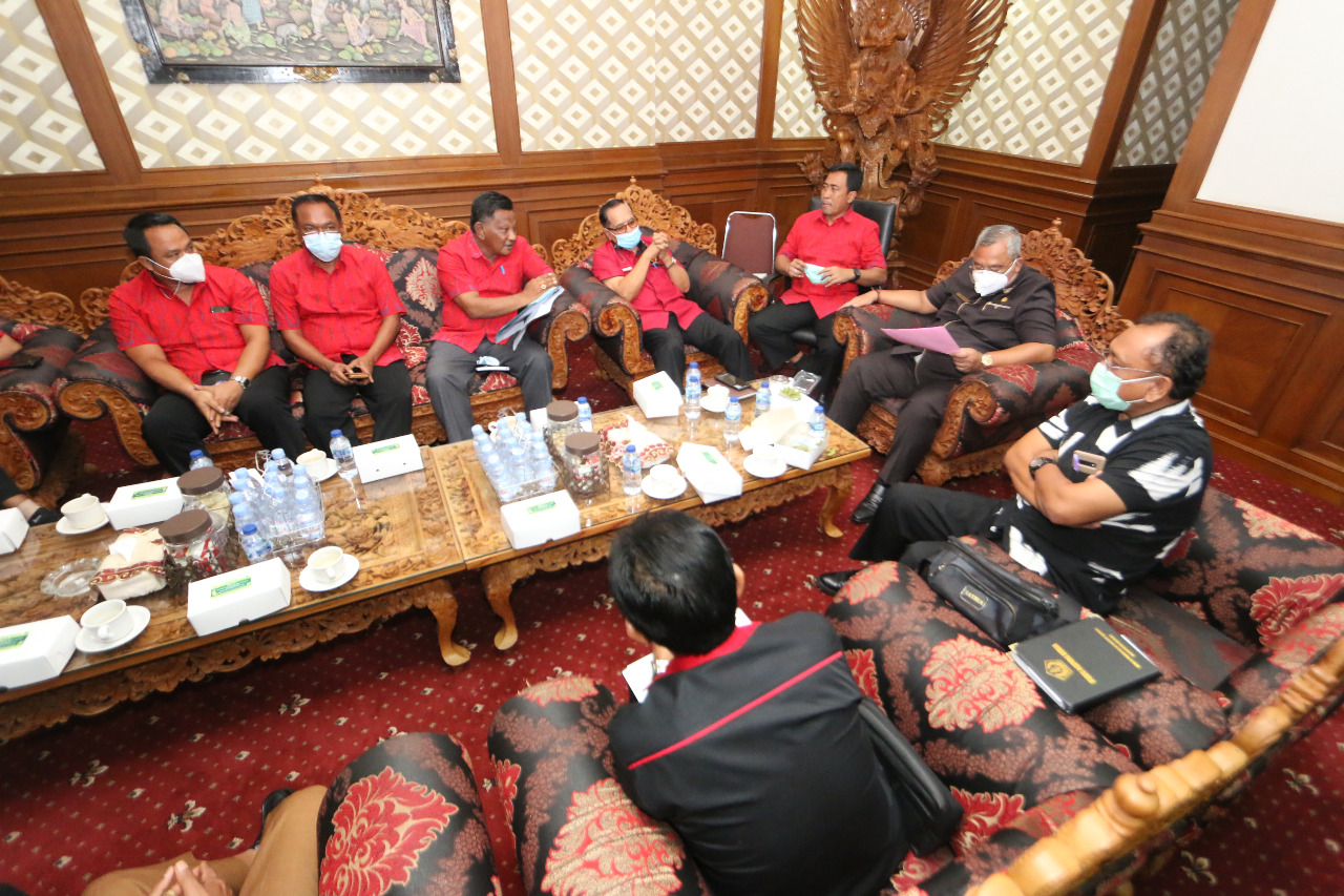 Ketua DPRD Kabupaten Badung, Putu Parwata bersama Persatuan Renang Seluruh Indonesia (PRSI), Takahide Swimming Centre (TSC) dan Komite Olahraga Nasional Indonesia (KONI) duduk bersama di ruang Ketua DPRD Badung, Senin (21/02/2022).