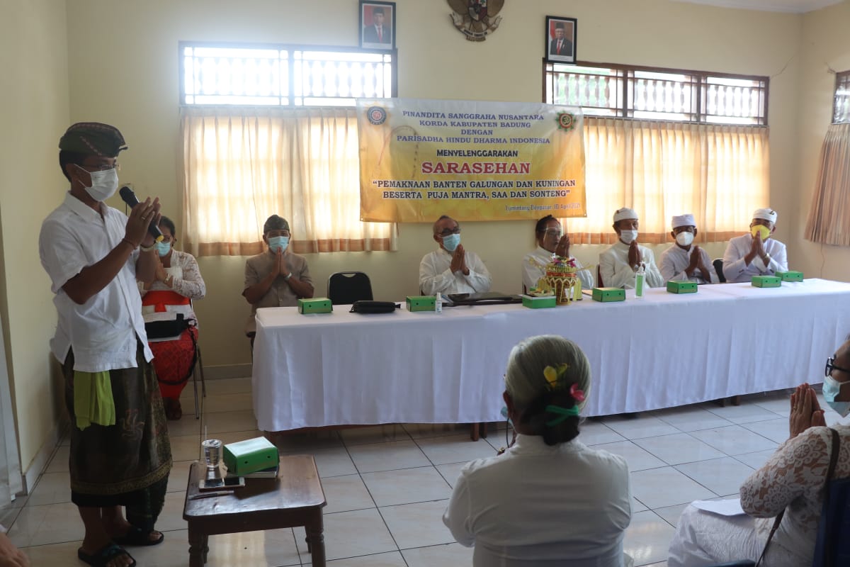 Ketua Pinandita Sanggraha Nusantara (PSN) Korda Kabupaten Badung I Nyoman Sukendra melaporkan, sarasehan ini mengambil tema “Sarasehan Makna Banten Galungan dan Kuningan, Ista Dewata, Puja Mantra, Puja SAA, Puja Sonteng” yang diikuti pinandita/pemangku se-Badung berjumlah 43 orang. “Dipilihnya makna banten Galungan dan Kuningan sebagai prioritas pertama mengingat umat Hindu dalam waktu dekat akan menyambut Hari Raya Galungan dan Kuningan,” ujarnya seraya menambahkan hal ini juga dalam rangka memperkuat kualitas SDM kepemangkuan yang memerlukan penyamaan pandangan, gerak langkah antara lain dalam pemaknaan banten, tujuan dan fungsi banten demikian juga dalam melaksanakan upacara.
