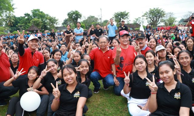 BERBAUR – Puluhan ribu warga Karangasem berbaur bersama Gubernur Wayan Koster dalam pre event Creative Fun Walk Digifest II tahun 2023, Minggu (4/6/2023).