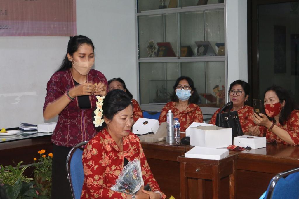 SANGGUL BALI – Pelatihan memakai sanggul Bali serangkaian HUT ke-22 DWP Unud, Selasa (7/12).