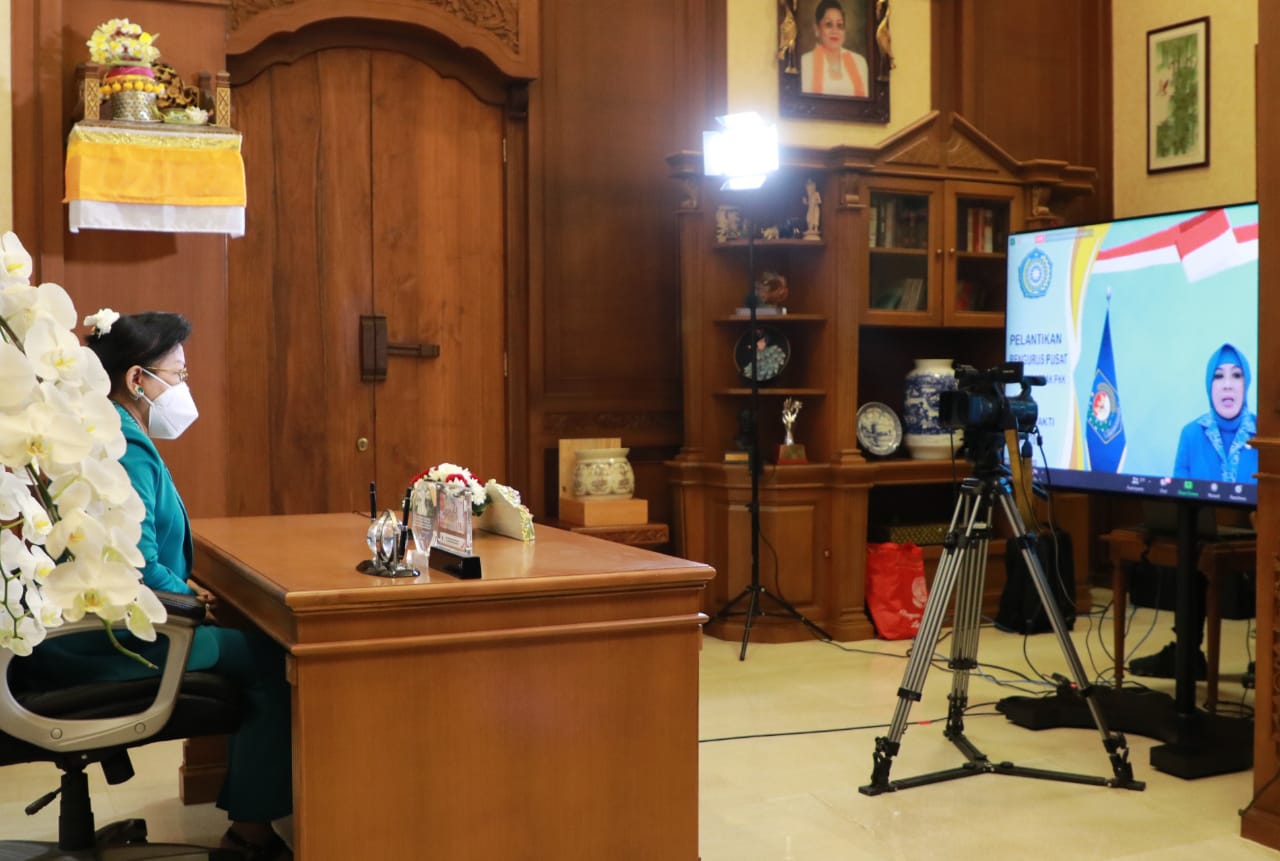 DILANTIK – Ketua TP PKK Provinsi Bali Ny. Putri Koster saat mengikuti pelantikan dan serah terima jabatan pengurus TP PKK Pusat, Rabu (11/11/2020).