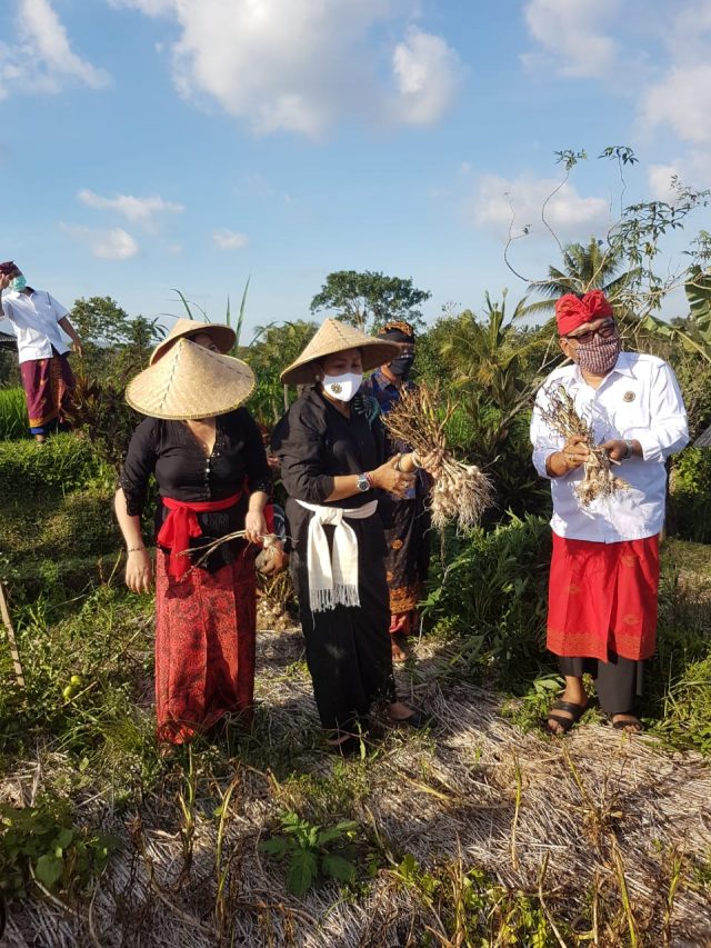 Ketua Tim Penggerak PKK Provinsi Bali Ny. Putri Suastini Koster didampingi Ketua TP PKK Tabanan Ny. Rai Wahyuni Sanjaya, Minggu (13/9/2020) melakukan panen bawang putih di Desa Babahan, Kecamatan Penebel, Kabupaten Tabanan. Selain itu, hadir juga OPD terkait, camat, kades serta anggota Fraksi PDI Perjuangan DPRD Tabanan.