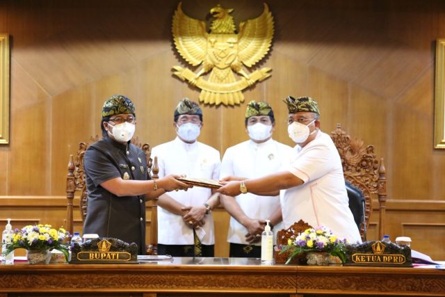 DOKUMEN PU – Putu Parwata didampingi Waka Wayan Suyasa dan Made Sunartha saat menyerahkan dokumen PU kepada Bupati Nyoman Giri Prasta, Jumat (9/7/2021).