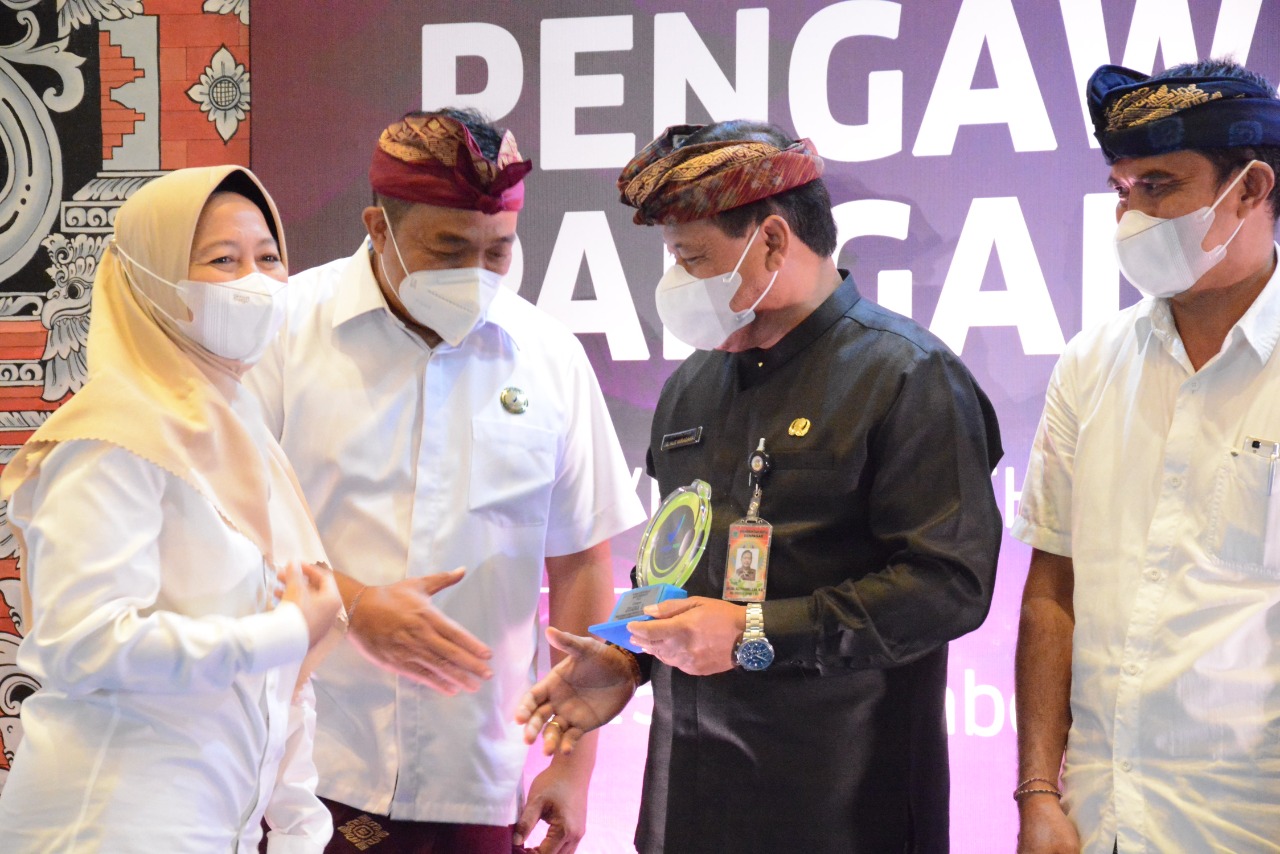 PALING AMAN – Pasar Nyanggelan Panjer dinobatkan sebagai pasar paling aman dari bahan berbahaya tingkat nasional. Penghargaannya diterima Sekda IB Alit Wiradana.