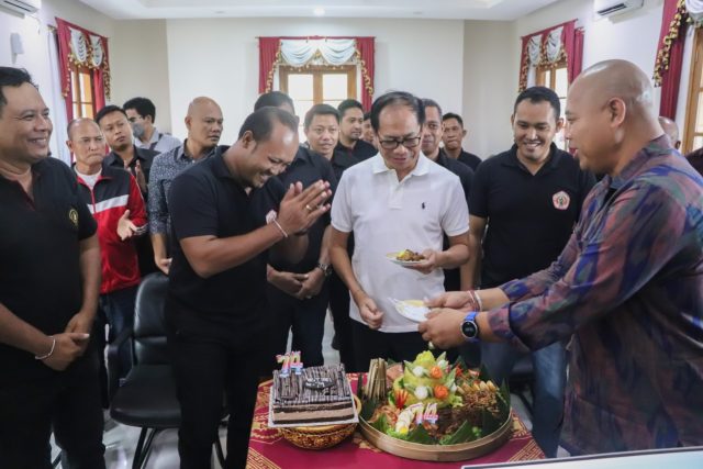 Wakil Bupati Badung I Ketut Suiasa yang juga Ketua IPSI Bali, menghadiri Rapat Koordinasi Halal Bihalal sekaligus memperingati HUT ke-74 Ikatan Pencak Silat Indonesia (IPSI) yang ditandai dengan pemotongan tumpeng, Sabtu (28/5) bertempat di Ruang Pertemuan Rumah Jabatan Wakil Bupati Badung. Dalam kesempatan ini hadir pula Sekretaris IPSI Bali I Nyoman Yamadhiputra, Ketua Harian IPSI Bali I Bagus Jagra Wibawa, Ketua dan perwakilan IPSI masing-masing kabupaten/kota se-Bali.