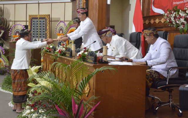 LAPORAN PEMBAHASAN – Ketua DPRD Bali Dewa Made Mahayadnya menerima laporan akhir pembahasan Raperda Bale Kerta Adhyaksa dari pembaca Tri Candra Arka, dalam rapat paripurna ke-34, Kamis (14/8/2025).