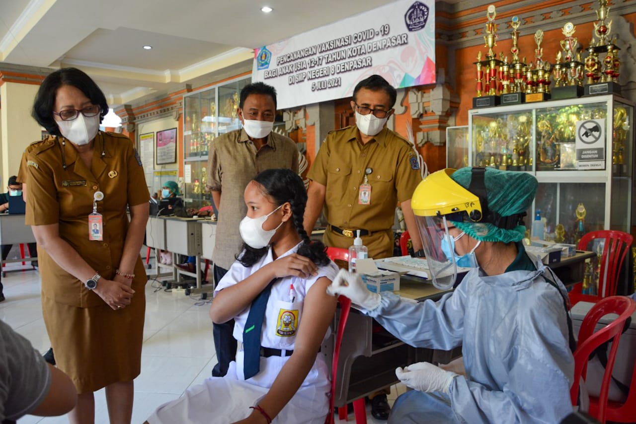 Pelaksanaan vaksinasi covid-19 pada anak usia 12-17 tahun di Kota Denpasar resmi dimulai. Pencanangan pelaksanaan vaksinasi tersebut dipimpin langsung Walikota Denpasar, I Gusti Ngurah Jaya Negara bersama Ketua DPRD Kota Denpasar, I Gusti Ngurah Gede di SMPN 8 Denpasar pada Senin (5/7).