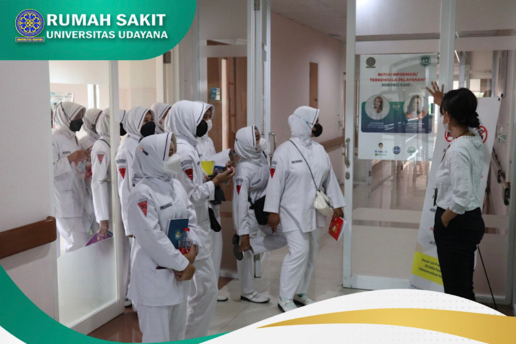 RS Universitas Udayana terima kunjungan dari SMK KES Bakti Indonesia Medika Probolinggo, Senin (9/1/2023). Kunjungan industri tersebut dihadiri oleh siswa-siswi beserta guru dari SMK KES Bakti Indonesia Medika Probolinggo yang diterima langsung oleh Kepala Instalasi Pendidikan dan Pelatihan (Diklat) RS Unud, Ns. Putu Kusumayuni, S.Kep di area RS Universitas Udayana sekaligus membagi siswa-siswi yang datang menjadi beberapa kelompok untuk mengikuti kegiatan Hospital Tour.