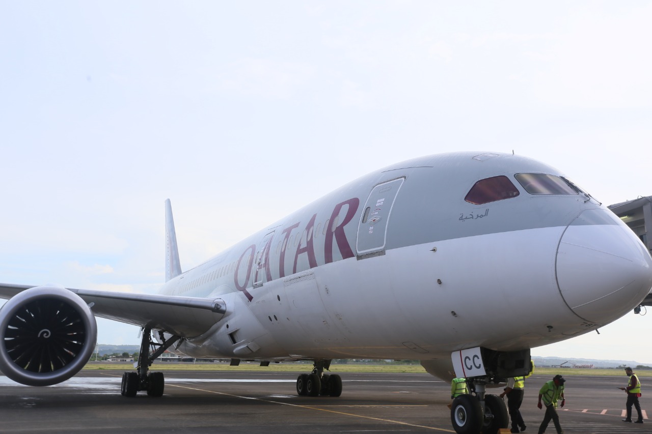 Qatar Airways hadir kembali di Bandara Internasional I Gusti Ngurah Rai, Bali mengawali penerbangan perdananya menggunakan pesawat tipe Boeing 787-8 Dreamlier registrasi A7-BCC rute Doha – Denpasar, Minggu (27/3).