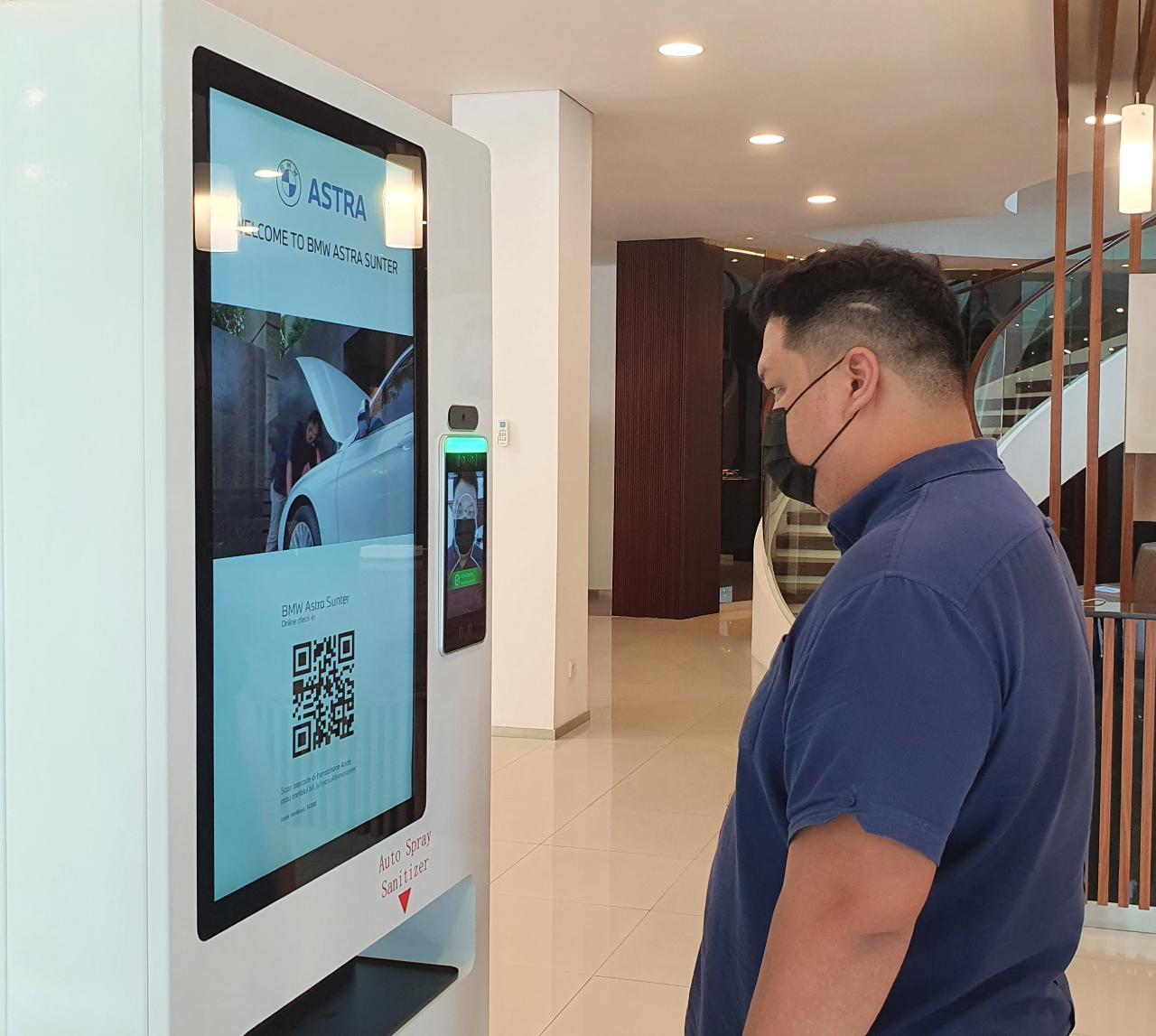 Setelah pelanggan melakukan pemeriksaan suhu tubuh, pelanggan wajib mengisi data diri dengan scan QR Code pada layar menggunakan ponsel. Cairan pembersih tangan tersedia juga dalam satu alat yang sama. Pelanggan BMW Astra dapat melihat progres servis kendaraan melalui layar monitor di area