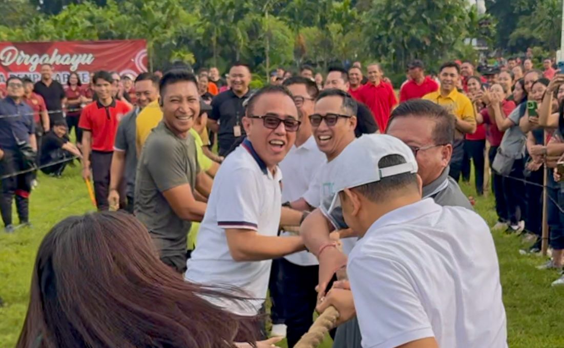 TARIK TAMBANG – Lomba tarik tambang serangkaian HUT ke-237 Kota Denpasar, Jumat (14/2/2025).