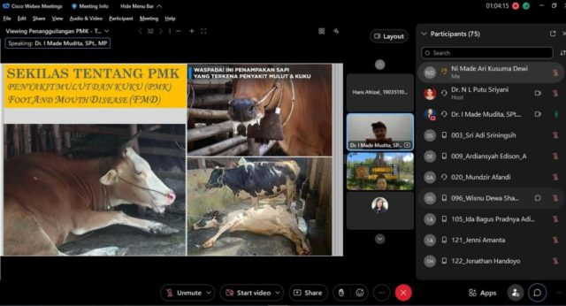 Untuk menindaklanjuti pembentukan Satuan Tugas Penyakit Mulut dan Kuku (Satgas PMK), Fakultas Peternakan Universitas Udayana (Fapet Unud) melaksanakan pengarahan dan pembekalan kepada seluruh anggota sebelum terjun ke lapangan. Pelaksanaan pengarahan dan pembekalan dilaksanakan secara online pada hari Kamis (14/7/2022).