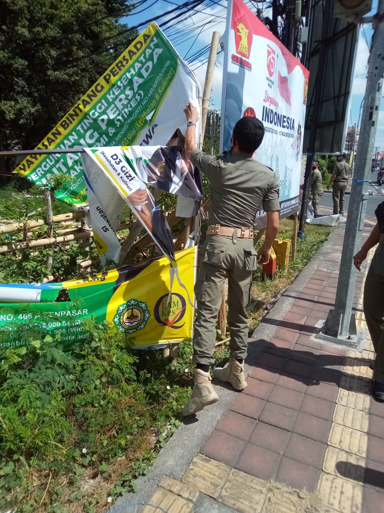 Guna Membuat wajah kota yg bersih dan asri di setiap sudut Kota Denpasar, Satpol PP Kota Denpasar kembali melaksanakan penertiban baliho dan spanduk di seluruh ruas Jalan Gunung Agung dan sekitarnya, Senin (23/8/2020). Kegiatan kali ini dipimpin langsung Kasatpol PP Kota Denpasar Dewa Gede Anom Sayoga.