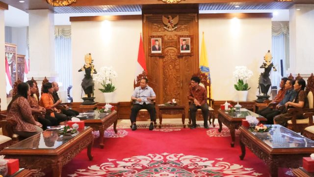 AUDIENSI – Pj. Gubernur SM Mahendra Jaya menerima audiensi jajaran SMAN 1 Singaraja serta Ikamasa di Jaya Sabha, Sabtu (7/10/2023).
