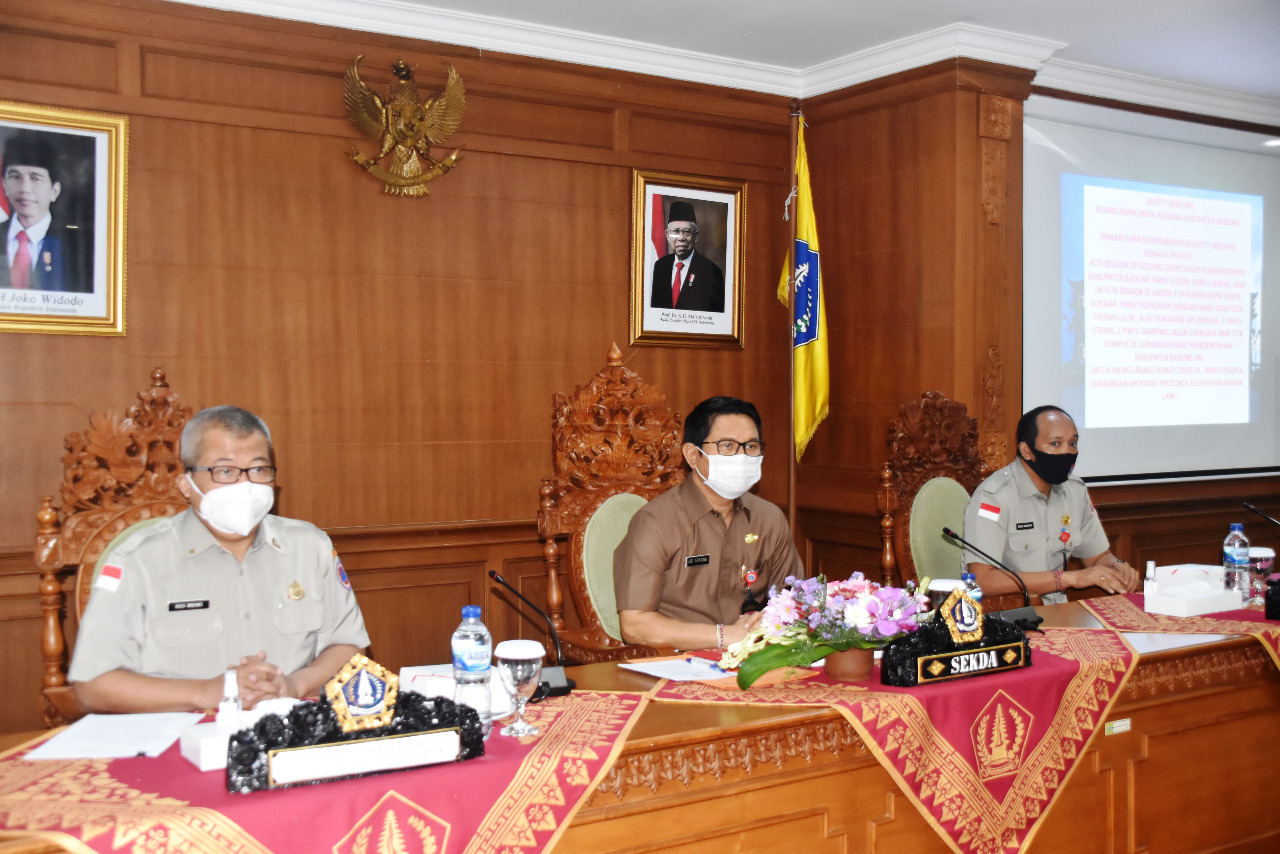 Sekretaris Daerah Kabupaten Badung I Wayan Adi Arnawa membuka sosialisasi dan penilaian kabupaten/kota tangguh bencana Kabupaten Badung tahun 2020, bertempat di Ruang Kriya Gosana Puspem Badung Mangupraja Mandala, Selasa (1/9/2020). Sosialisasi yang dilaksanakan dengan tetap menerapkan protokol kesehatan ini diikuti 30 peserta dan juga dihadiri oleh Direktur Pengembangan Strategi Penanggulangan Bencana BNPB Dr. Ir. Agus Wibowo, Kepala Pelaksana BPBD Kabupaten Badung Bagus Nyoman Wiranata beserta narasumber fasilitator nasional Dewi Reni Angreni.