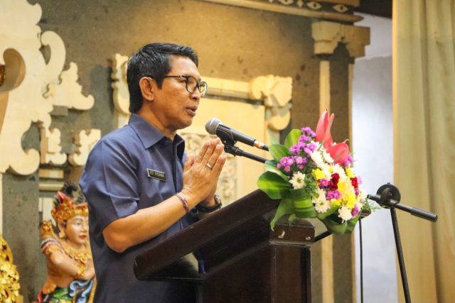 KAMPANYE – Sekda Wayan Adi Arnawa menghadiri kegiatan kampanye/sosialisasi RPLP2B di ruang pertemuan Pandawa Hotel Made Bali, Selasa (12/7).