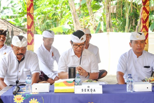 MELASPAS – Sekda Wayan Adi Arnawa melaksanakan persembahyangan bersama serangkaian karya melaspas dan mendem pedagingan di Pura Subak Abian Jemeng Sari Banjar Anyar, Desa Sembung, Kecamatan Mengwi, Sabtu (10/12).