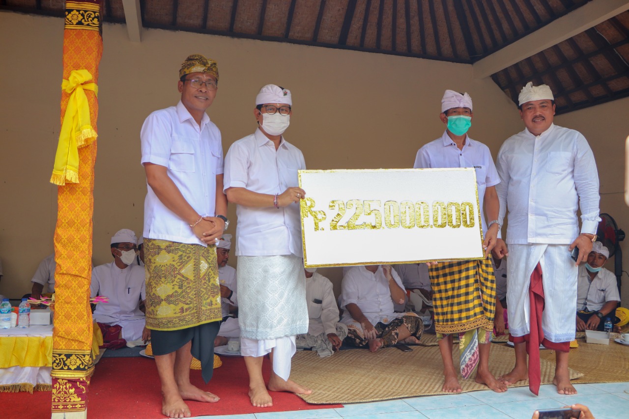 Seusai melakukan persembahyangan bersama dengan masyarakat setempat, Sekda Badung Wayan Adi Arnawa menyerahkan dana Bantuan Keuangan Khusus (BKK) sebesar Rp 225 juta yang diterima Manggala Karya I Wayan Martana. (dev/hmbad)