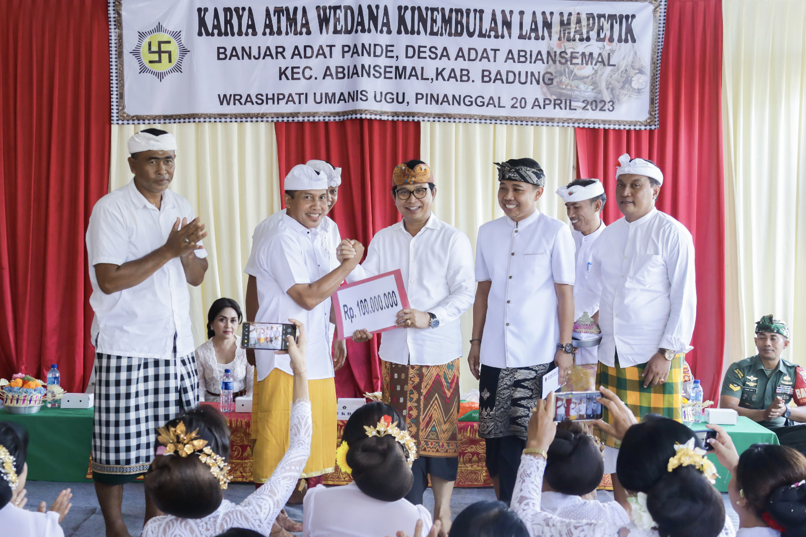 Pada kesempatan tersebut, Sekda Adi Arnawa menyerahkan bantuan keuangan khusus (BKK) induk tahun 2023 sebesar Rp 100 juta kepada Manggala Karya I Nyoman Artana, disaksikan oleh masyarakat setempat.